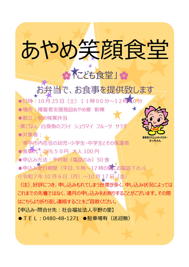 あやめ笑顔食堂は10月も元気に開催を予定しております。